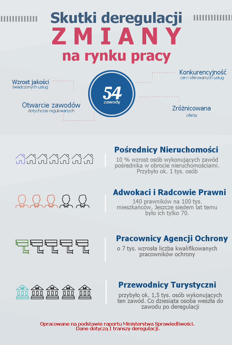 Jedni wskazują, że trudniej wejść do zawodu, inni że rynek po deregulacji jest nasycony i trudniej o pracę, a poziom świadczonych usług ucierpiał. Jednak raport wskazuje, że usługi są na wyższym poziomie, a oferta bardziej zróżnicowana. Przewodnicy turystyczni oferują nowe formy zwiedzania, np. rowerem. A kancelarie notarialne w dni powszednie są dłużej otwarte, nawet do godz. 19, a coraz częściej pracują też w soboty.